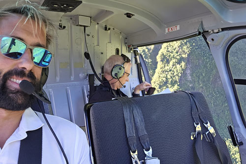 Jérémy OUZE, pilote et André BOUR prenant une vidéo de la cascade avec son iPhone, avec la porte arrière ouverte