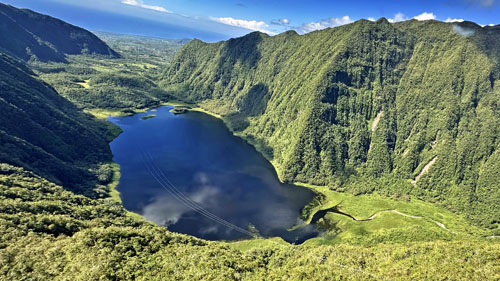 Grand Etang, on aperçoit la ligne électrique qui vient de la Centrale électrique de Takamaka