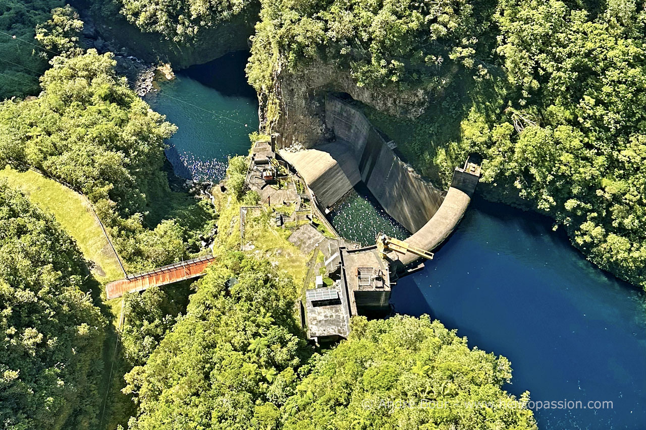 Centrale de Takamaka, on aperçoit le téléphérique qui relie la plateforme de la centrale au Belvédère de Takamaka plus haut. Une hélistation permet de poser en hélicoptère sur la plateforme