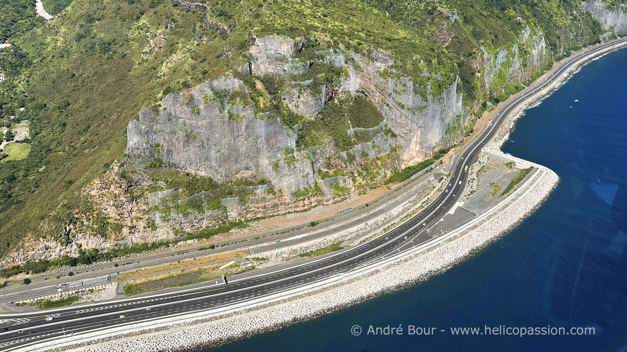 Survol de la nouvelle route du Littoral, vers la Grande Chaloupe, où la nouvelle route du Littoral rejoint l'ancienne route