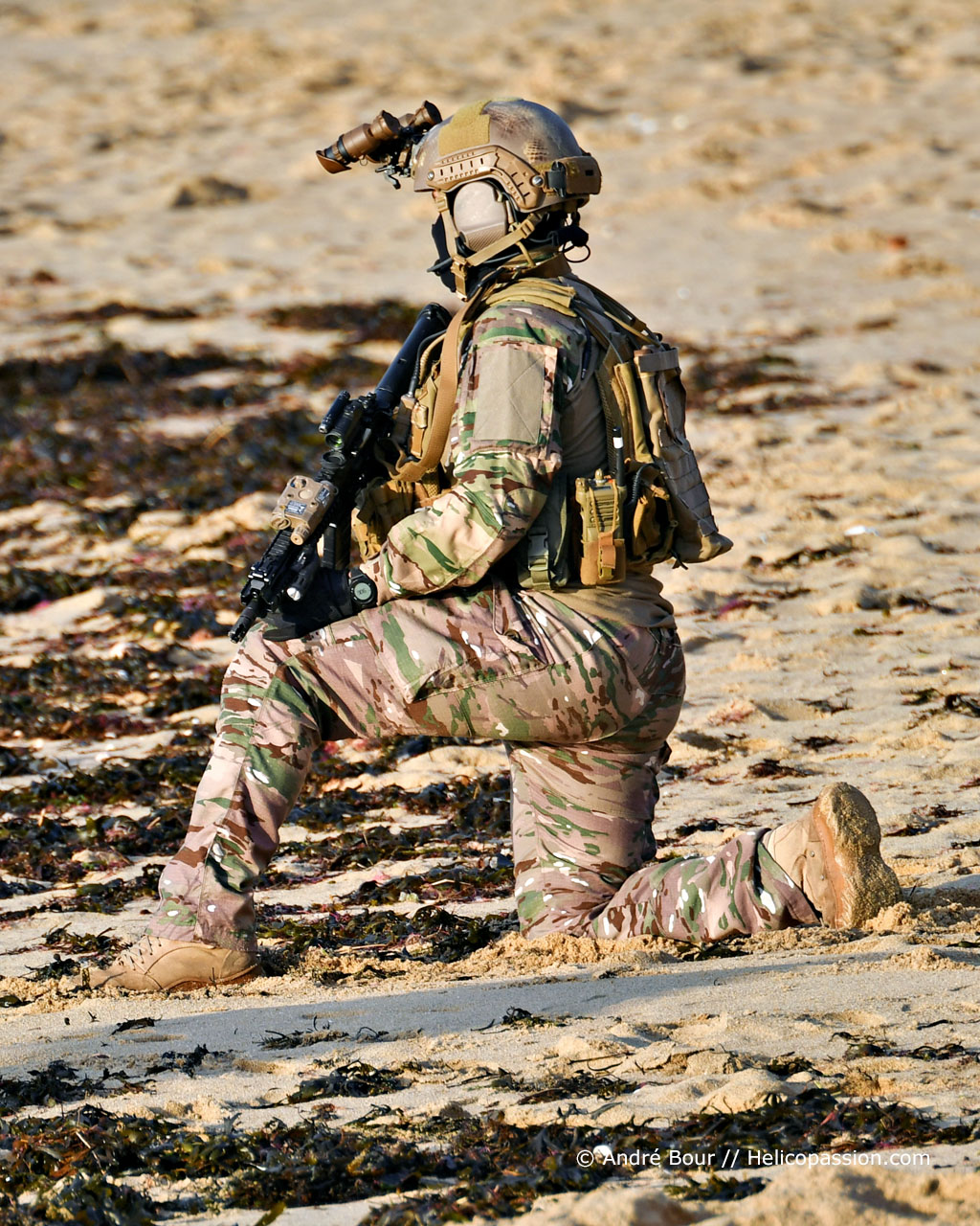 Un militaire de l’Armée de Terre en position sur un point dominant la plage, équipé de lunettes de vision nocturne. Ce type de dispositif laisse supposer une infiltration préalable, probablement menée de nuit, afin d’observer et sécuriser la zone avant l’arrivée des premiers moyens amphibies