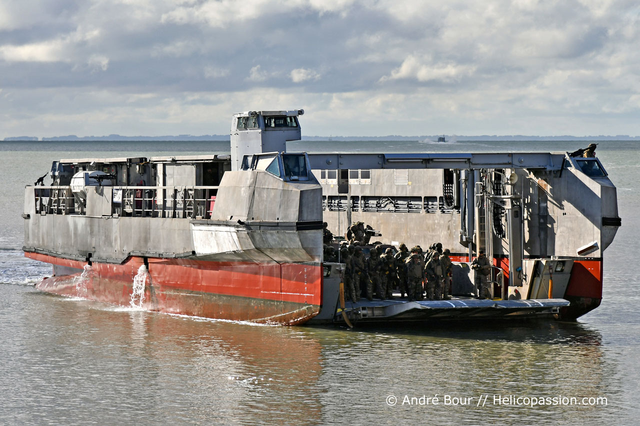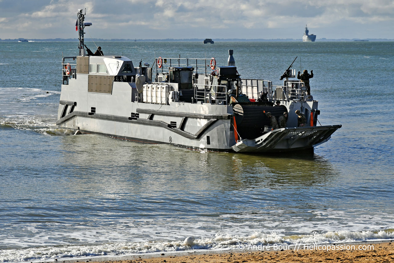 Mise à terre des troupes depuis un EDAS, sous protection du dispositif établi sur la plage