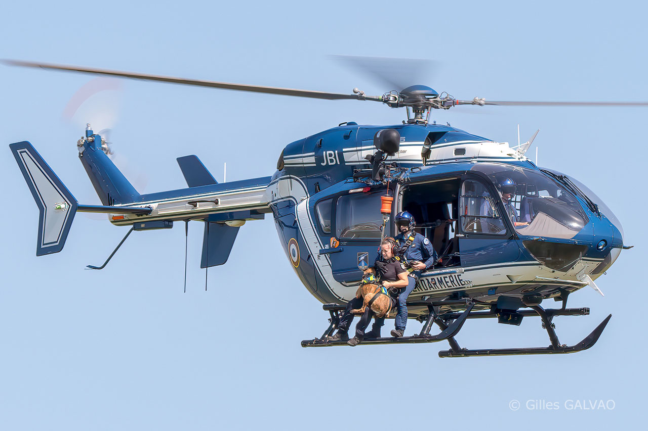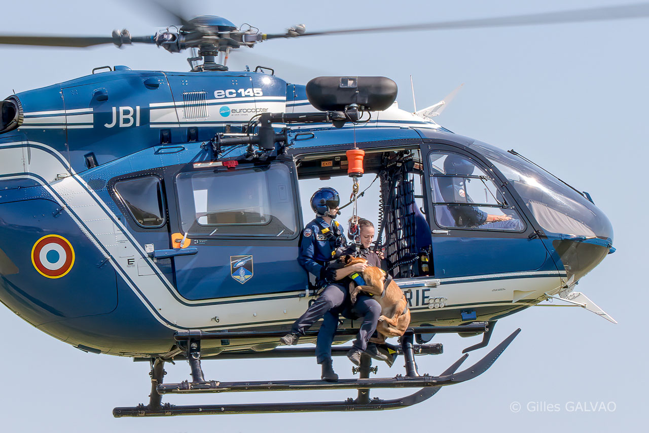 Hélitreuillage d'un binôme K9 par un hélicoptère EC145 de la Gendarmerie Nationale