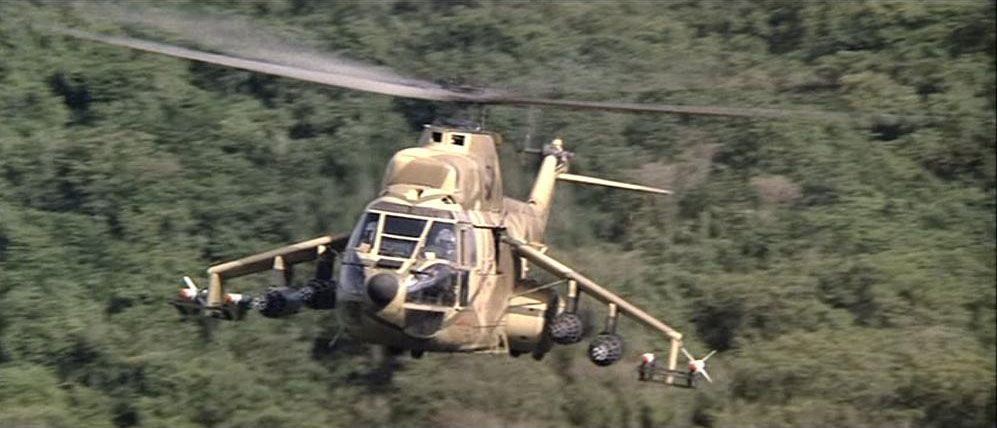 L'hélicoptère est censé être un MI24 Hind russe. Le metteur en scène a utilisé des hélicoptères Puma à qui on a ajouté des ailerons latéraux et une visière à l'avant pour ressembler à un MI24