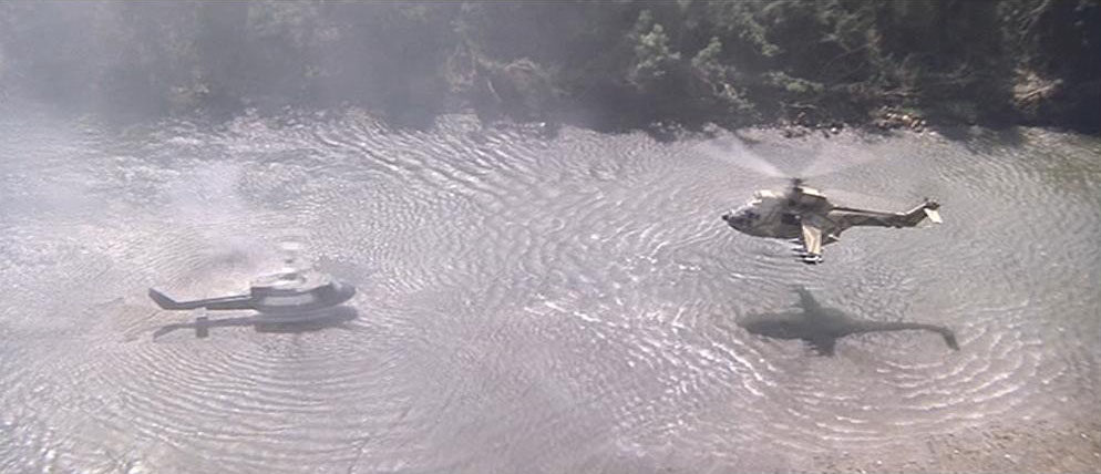 Dans Jurassic Park (1993), l'hélicoptère joue un rôle emblématique dès la scène d'introduction : un Agusta A109 transporte les visiteurs vers Isla Nublar en survolant l'océan, la jungle et les falaises de l'île. Filmée dans les paysages spectaculaires de l'île de Kaua'i à Hawaï, notamment la vallée de Manawaiopuna Falls, cette scène iconique installe d'emblée la transition entre le monde réel et l'univers fantastique du parc. Aucun danger ici : l'hélicoptère symbolise la maîtrise technologique et le contôrle apparent de la situation... un contraste frappant avec le chaos qui suivra.