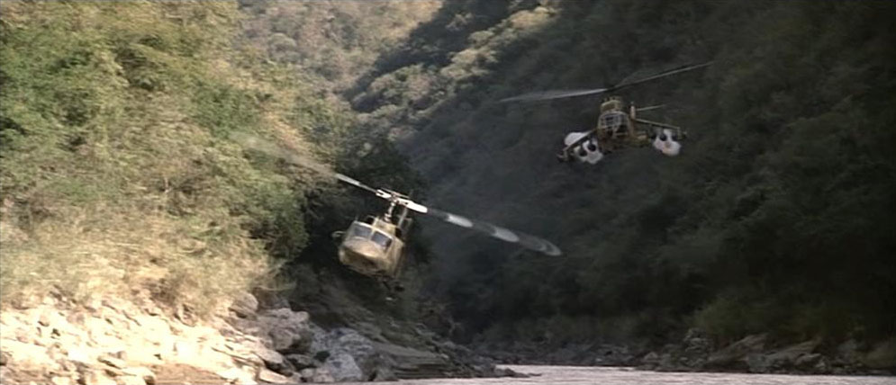 Dans le film Rambo II, un hélicoptère UH1 Huey et un MI24 Hind s'affronte dans un canyon...
