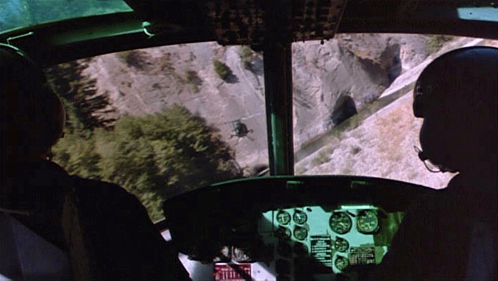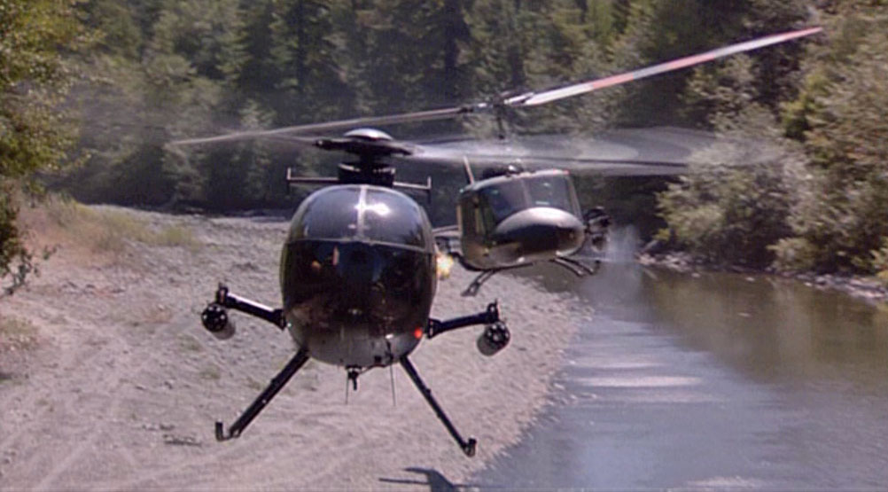 Dans Alerte ! (1995), le final met en scène un duel aérien entre l'OH6 du héros et deux Huey de l'armée. Vols en rase-mottes dans le lit d'une rivière, virages serrés et tension maximale font de cette poursuite le point culminant du film.