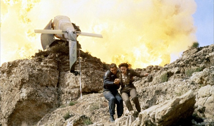 Dans Broken Arrow (1996), pas moins de quatre hélicoptères explosent ! L'une des scènes les plus marquantes met en jeu un hélicoptère qui s'écrase au bord d'une falaise, dont les 2 héros parviennent à s'éloigner in extremis. Le rotor encore en mouvement, la cabine au bord du précipice illustre combien l'hélicoptère est utilisé comme ressort d'action et de suspense.