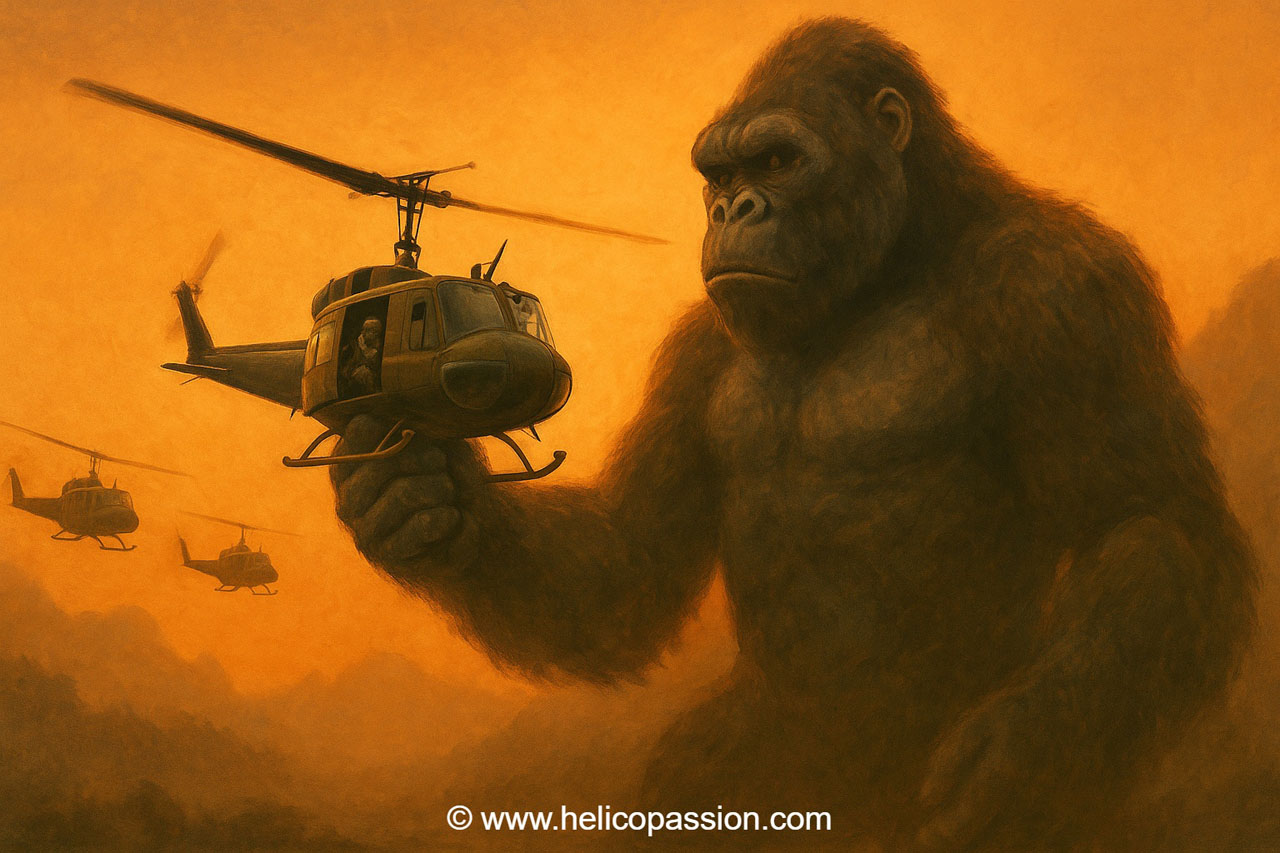 Dans Kong Skull Island (2017), l'arrivée des hélicoptères est d'abord triomphante : une formation de Huey traverse la brume et pénètre dans la vallée. Mais brusquement la scène bascule. En un seul geste, Kong brise la formation et projette les hélicoptères au sol. Cette séquence joue sur le contraste entre la puissance militaire organisée et la force sauvage de la créature transformant en quelques secondes une arrivée maitrisée en catastrophe totale.