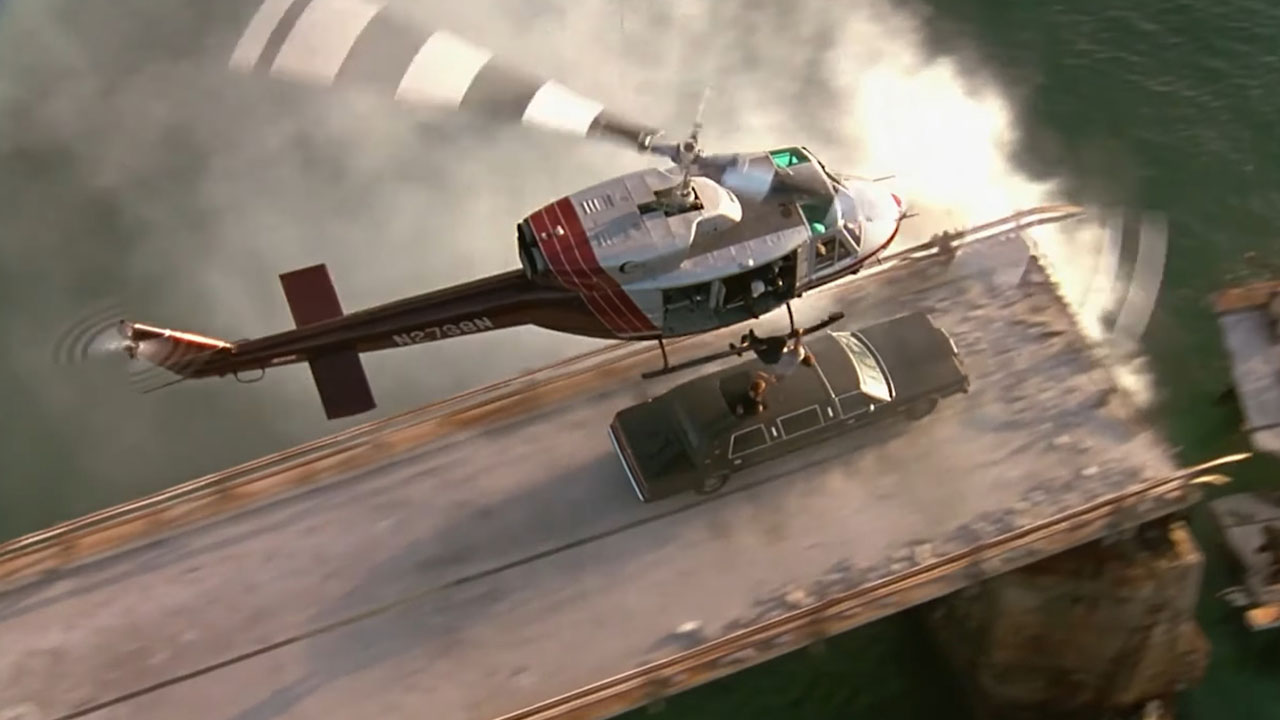 Dans True Lies (1994), une voiture roule à toute allure sur un pont coupé au-dessus de la mer, une femme parvient à s’extraire par le toit ouvrant de la voiture. Un homme accroché au patin d’un hélicoptère la récupère de justesse à bout de bras avant que le véhicule ne chute dans l’eau. Irréaliste mais parfaitement chorégraphiée, cette séquence est devenue emblématique du cinéma d’action des années 90.