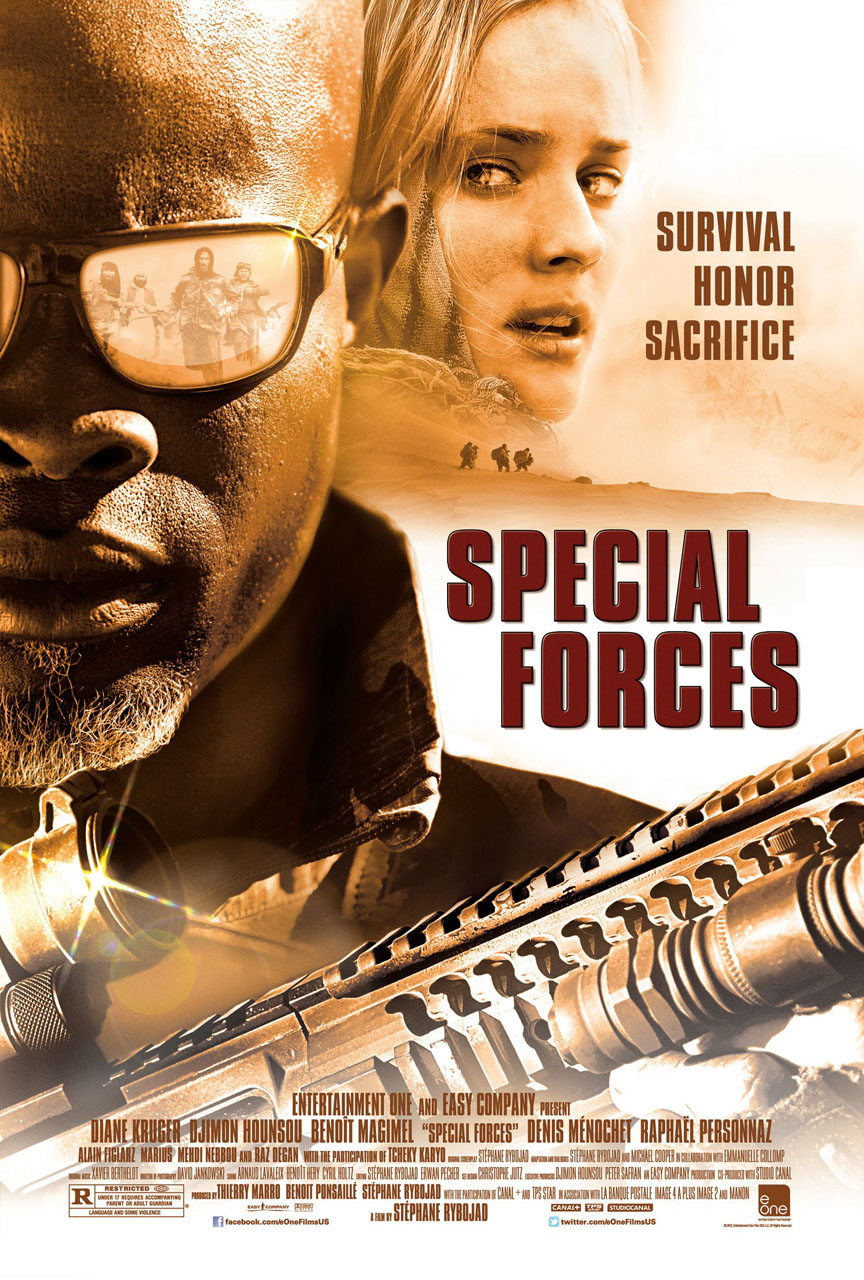 L'affiche américaine du film. Forces spéciales, de Stéphane Rybojad , 2011. Avec Diane Kruger, Djimon Hounsou, Benoît Magimel, Denis Ménochet, Raphaël Personnaz, Alain Figlarz, Tcheky Karyo, Marius (ancien militaire instructeur des forces spéciales)