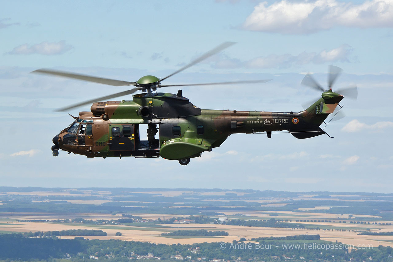 Le deuxième hélicoptère AS532 Cougar du groupe au décollage