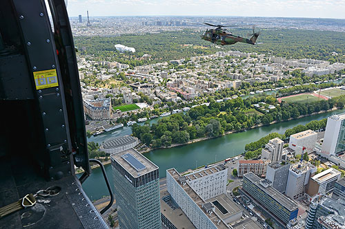 Nous rejoignons l'hélicoptère qui nous est assigné. Il s'agit d'un AS532 Cougar qui fait partie du groupe assaut, en queue de cortège. Notre appareil volera à gauche du groupe, un 2e Cougar sera à notre droite et un NH90 sera devant nous. Je suis positionné à la porte droite, ce qui va permettre de faire des photos des 2 autres hélicoptères du groupe devant la Tour Eiffel ainsi que des photos de Notre Dame de Paris.