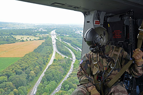 Nous rejoignons l'hélicoptère qui nous est assigné. Il s'agit d'un NH90 Caïman qui fait partie du groupe "Protéger sur le territoire National". Notre appareil volera à droite du groupe, un Cougar sera à notre gauche. Je suis équipé d'un harnais, ce qui me permettra de me positionner plus librement dans la cabine pendant le survol de Paris.