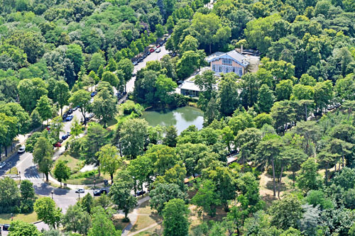 Parc des Princes, avec au fond le Bois de Boulogne et La Défense