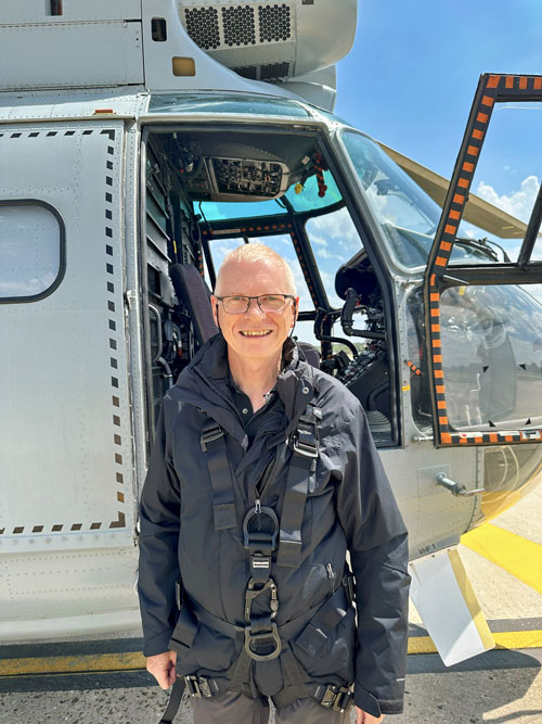 André Bour, devant l'hélicoptère Puma SAR. Le harnais permet de s'arrimer à l'intérieur de la cabine pour se déplacer en sécurité au niveau de la porte ouverte de l'appareil en vol