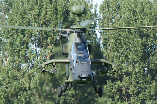 Hélicoptère d'attaque EC665 Tigre HAP de l'Armée de Terre française (ALAT). Notez la différence avec le Tigre allemand : canon à l'avant, pas de radar de mât
