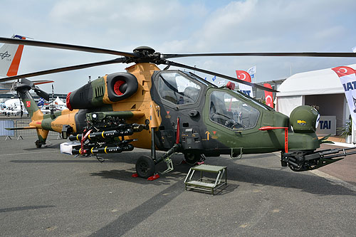 Détail de l'armement sous l'aileron d'emport gauche : panier de 4 roquettes guidées CIRIT (de fabrication turque, d'un poids de 15 kg, d'une portée de 8 km) et un panier de roquettes non guidées. Notez le cheminement externe de l'approvisionnement du canon