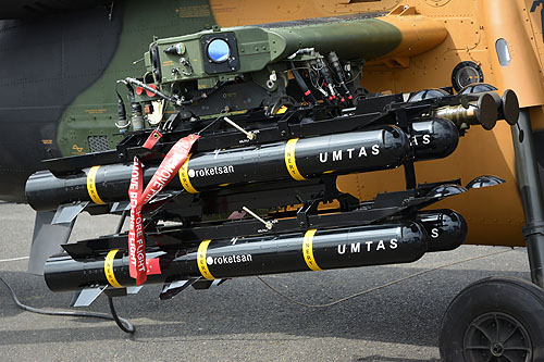 Le missile Rocketsan UMTAS, de fabrication turque, est un missile à guidage laser de type "Fire and Update", d'un poids de 37,5 kg et d'une portée de 8 km
