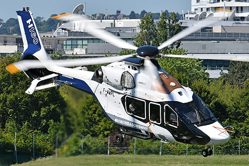 Le nouvel hélicoptère H160 d'Airbus Helicopters à l'héliport d'Issy les Moulineaux. Avec son design très réussi et ses nombreuses innovations, le H160 succèdera au Dauphin dans la gamme du constructeur, il vient d'être retenu par les armées françaises. Jusqu'ici seules des maquettes ont été présentées au public. L'appareil photographié est le second prototype, qui a volé l'an dernier aux Etats-Unis. Il effectuait des vols pour des clients VIP en marge du Salon aéronautique du Bourget