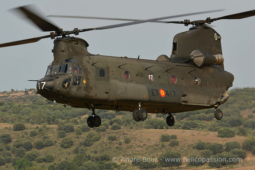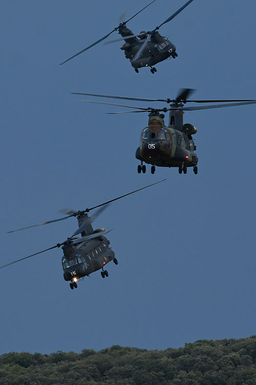 Cinq hélicoptères de transport lourd Chinook étaient présents dont 2 camouflés.