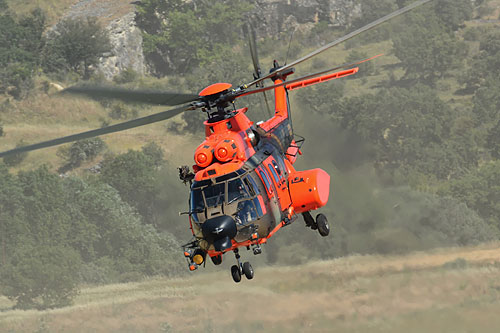 Hélicoptère AS532 AL Cougar ET670 de l'Unidad Militar de Emergencias (UME). A la base un camouflage militaire, par-dessus des bandes "rouge fluo" pour mieux signaler l'hélicoptère lors des opérations de lutte anti-incendies. 4 appareils de ce type sont en service en Espagne