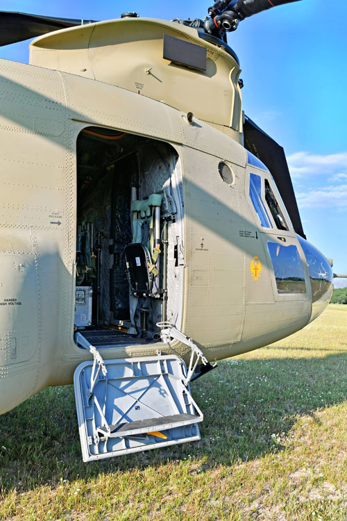 Cablage et conduites hydrauliques apparentes à l'arrière de la carlingue du CH47F Chinook