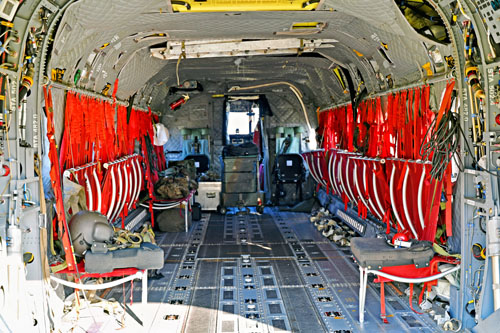 Sièges à l'intérieur des CH47F Chinook, le choix de la couleur rouge reste un mystère