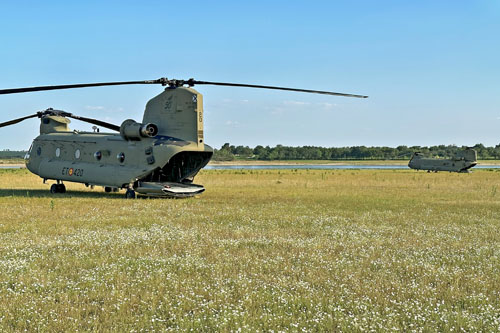 Un nouvel hélicoptère CH47F Chinook, au fond 2 CH47D avec les rotors démontés. Sur la base plusieurs CH47D semblaient ainsi retirés du service
