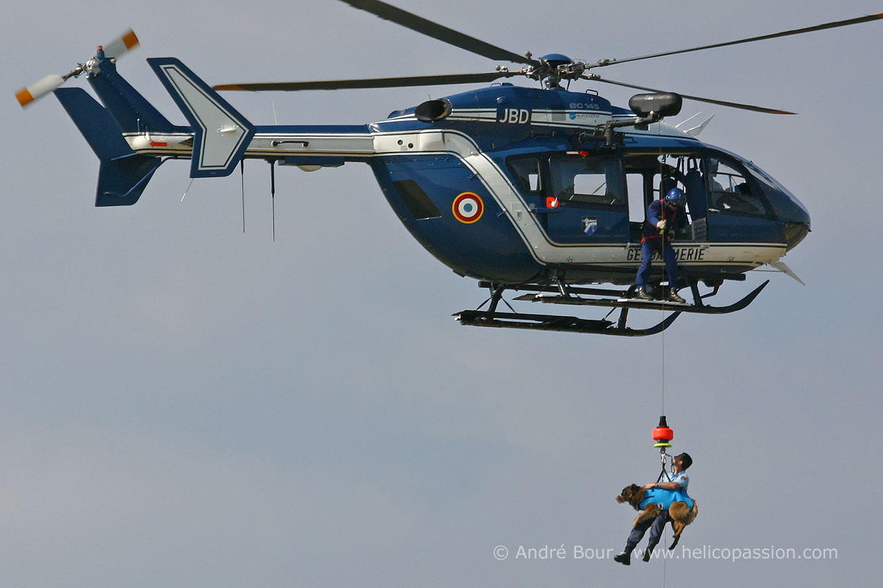 Hélitreuillage d'un sauveteur avec son chien par le nouvel hélicoptère EC145 de la Gendarmerie Nationale à Dax 2004