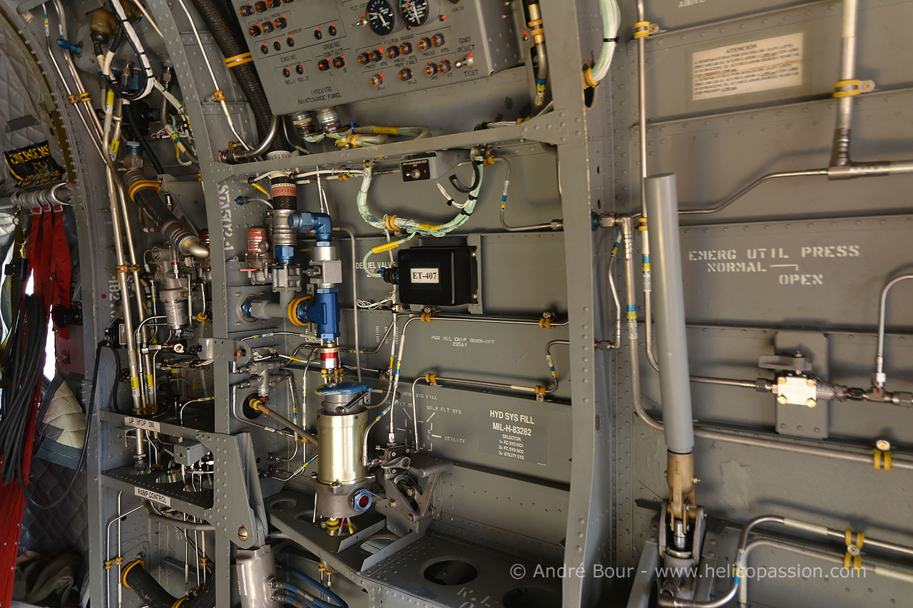 Vue de la soute, à partir de la rampe arrière. Au fond on aperçoit un réservoir de carburant supplémentaire