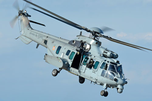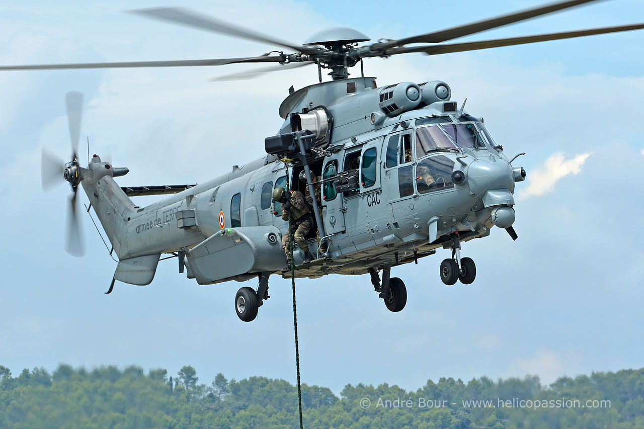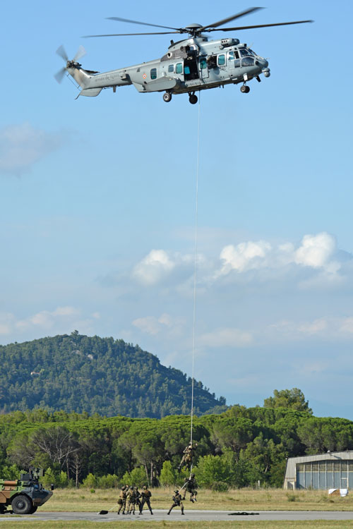 Le Caracal fait descendre une corde jusqu'au sol, pour récupérer les commandos par "grappe"