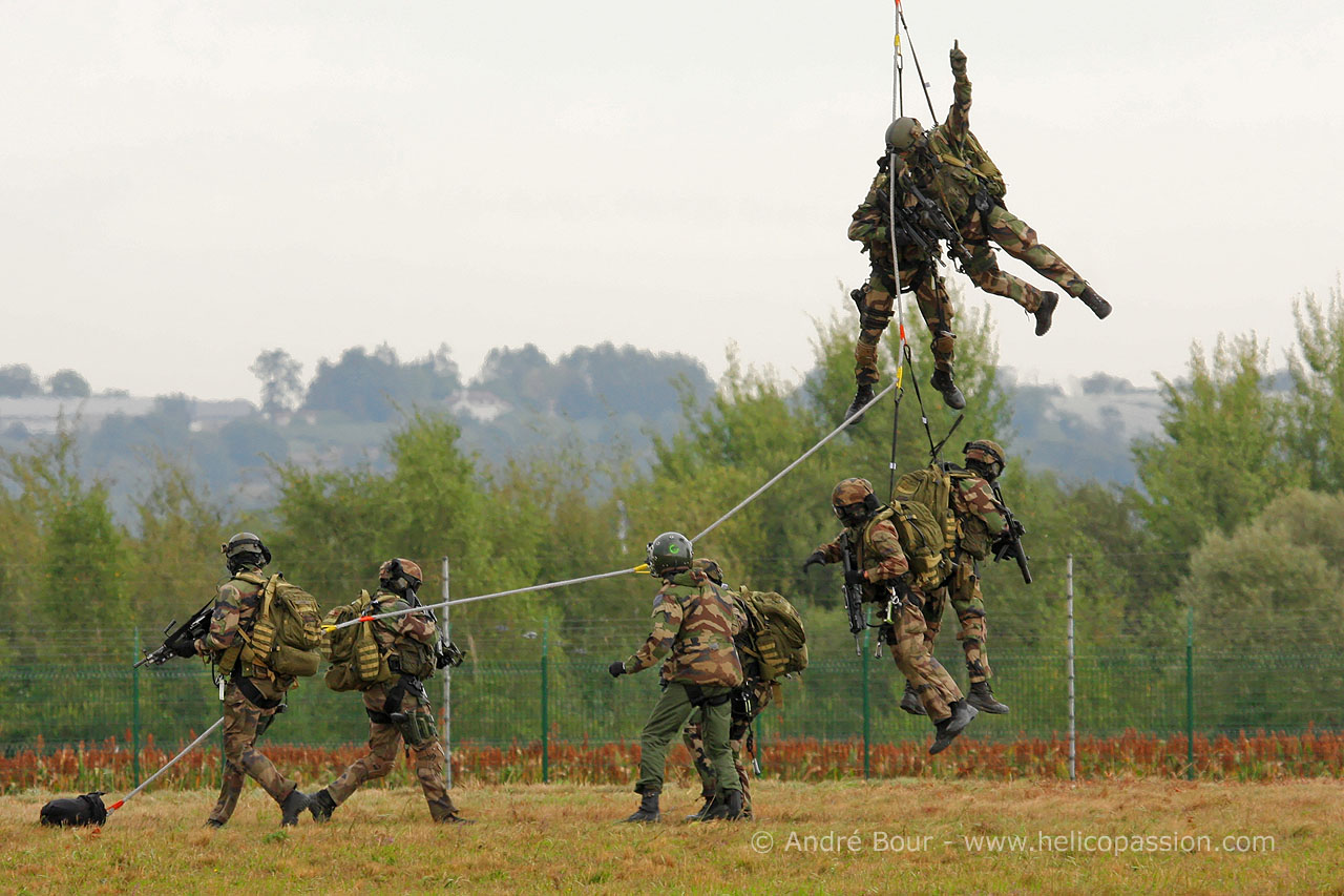 L'hélicoptère Puma soulève la "grappe" humaine et s'envole