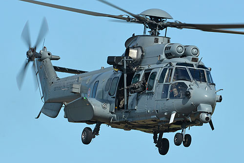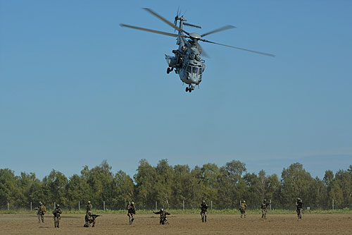Le Caracal vient se poser, au premier plan, le commando au sol porte la corde qui a servi à la grappe