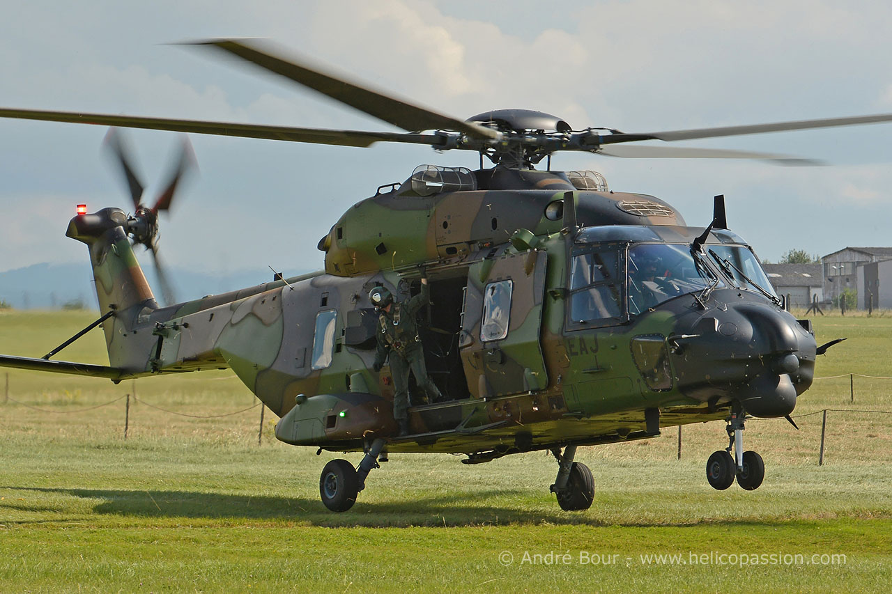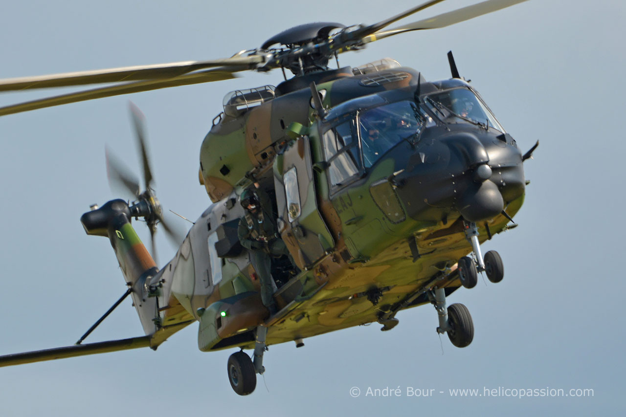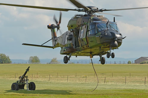 Un hélicoptère NH90 transporte sous élingue une pièce d'artillerie