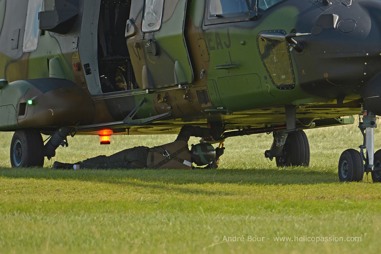 Le chef de bord accroche l'élingue au crochet sous l'hélicoptère
