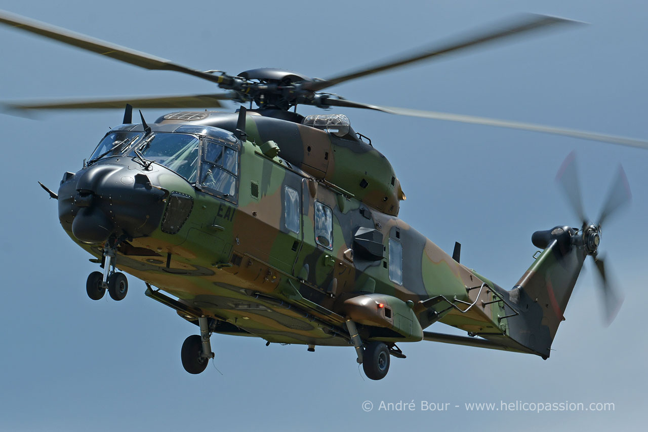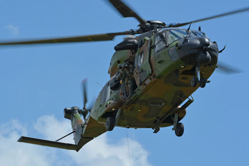 Un hélicoptère de transport NH90 Caïman, de l'ALAT (Aviation Légère de l'Armée de Terre) française, effectue une mission d'évacuation sanitaire (EVASAN ou MEDEVAC en anglais)