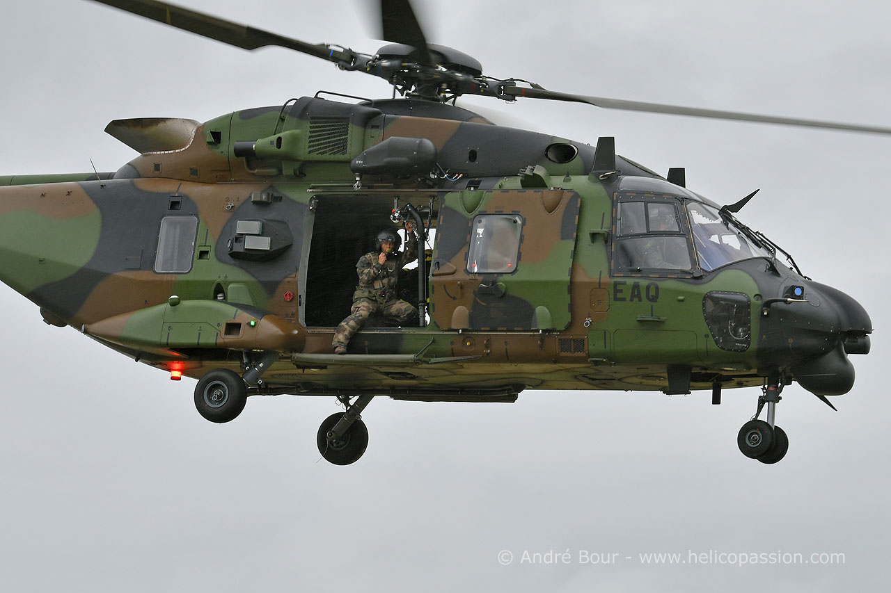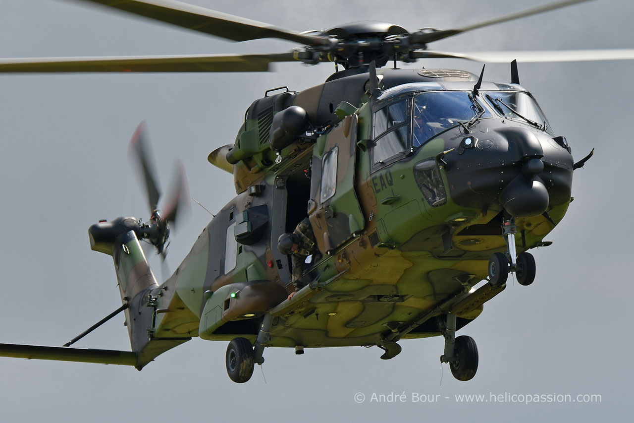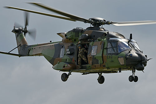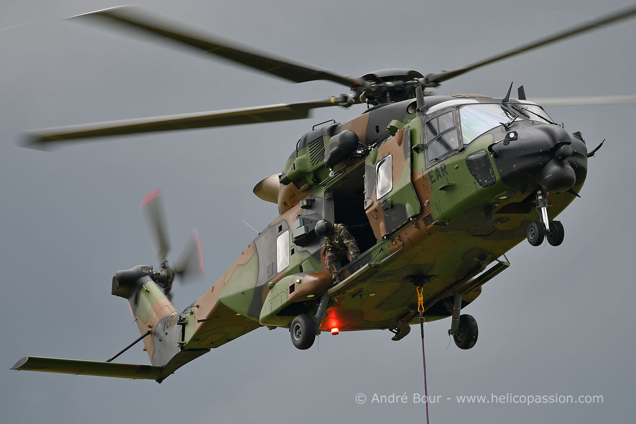 Arrivée d'un hélicoptère de transport NH90 Caïman, avec un réservoir souple sous élingue