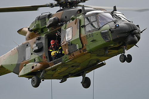 Arrivée d'un hélicoptère NH90 Caïman avec descende rapide en corde lisse d'une équipe de pompiers