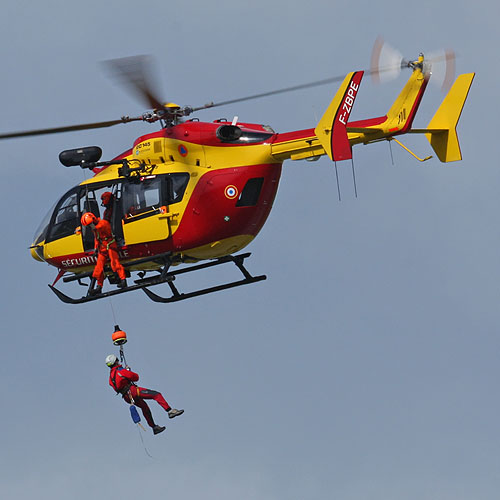 Hélitreuillage d'un sauveteur et de la victime sur un brancard