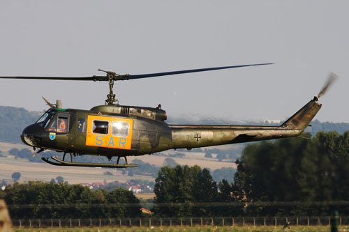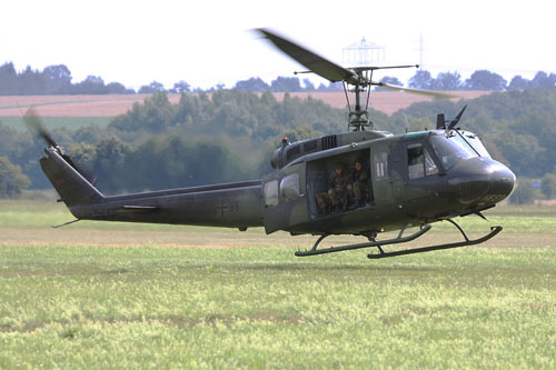Hélicoptère de transport NH90 en camouflage vert clair-vert sombre-noir allemand. Le NH90 remplacera progressivement les UH1D : 2 turbines au lieu d'une, transport de 16 soldats au lieu de 8, rampe arrière, charge utile de 2000 kg au lieu de 800, rayon d'action de 1200 km au lieu de 450 km !
