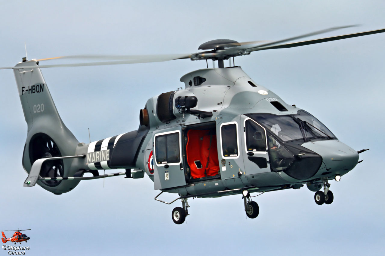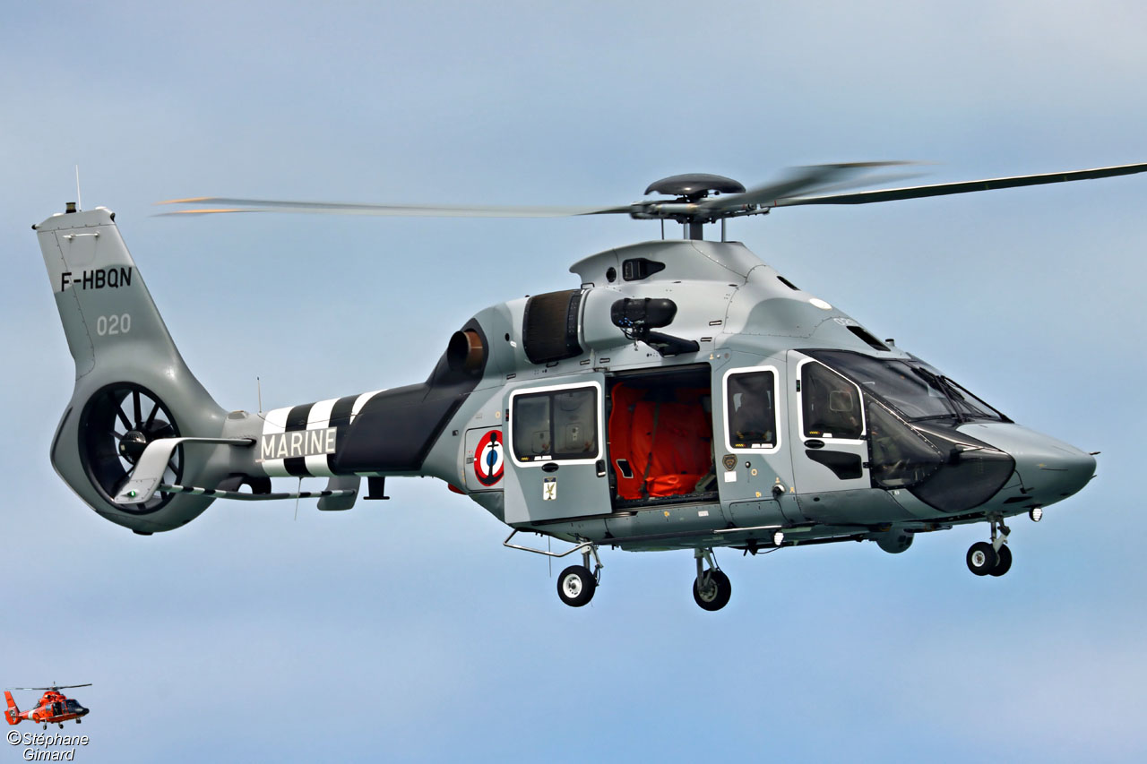 A l'occasion du 80e anniversaire du Jour J, l'hélicoptère H160 de la Flottille 32F de la Marine Nationale a effectué une démonstration de secours en mer. Il arbore les bandes d'invasion similaires à celles utilisées par les forces alliées lors du débarquement de Normandie.
