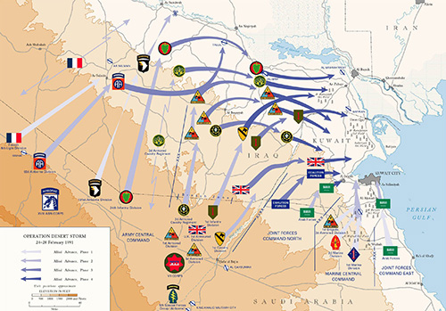 Pour libérer le Koweït, l'offensive terrestre s'est effectuée sur tout le sud-est de l'Irak jusqu'à As Samawah et Basra sur l'Euphrate