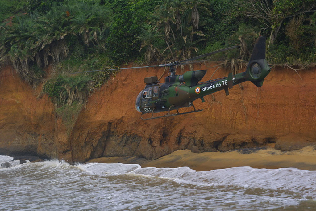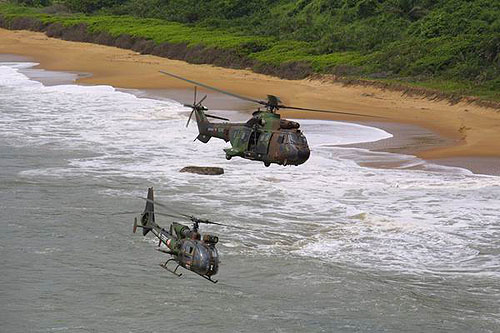 Des hélicoptères Cougar et Gazelle de l'ALAT française (Aviation Légère de l'Armée de Terre) survolent la Côte d'Ivoire