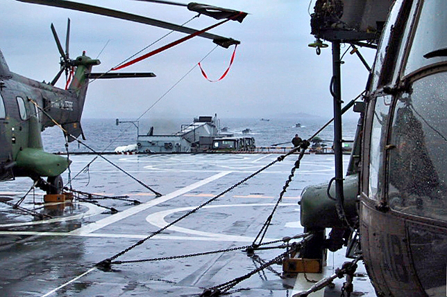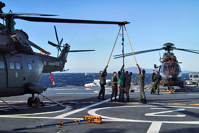 Sur le pont du navire, des commandos embarquent à bord d'un hélicoptère Cougar de l'ALAT