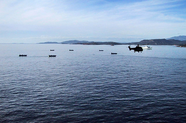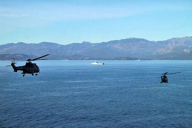 Assaut héliporté à partir de la mer lors de l’exercice d’assaut amphibie Catamaran 2001 en Méditerranée, avec les hélicoptères Cougar de l’ALAT embarqués sur le TCD Foudre.