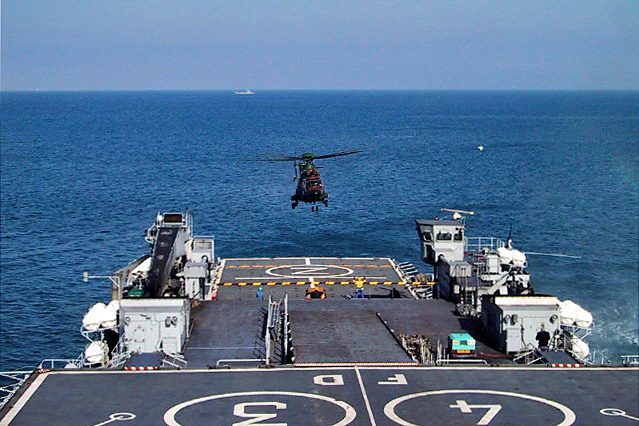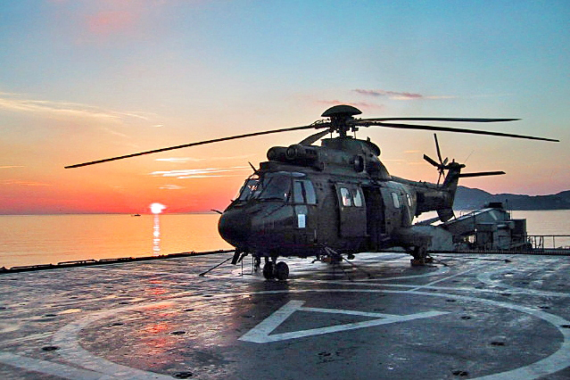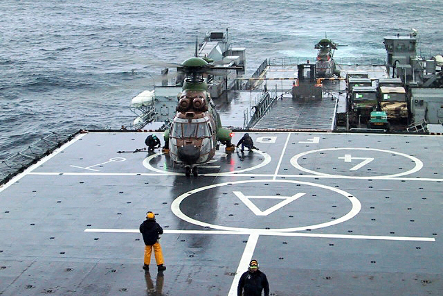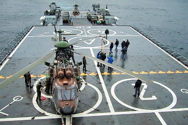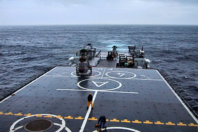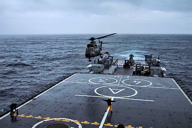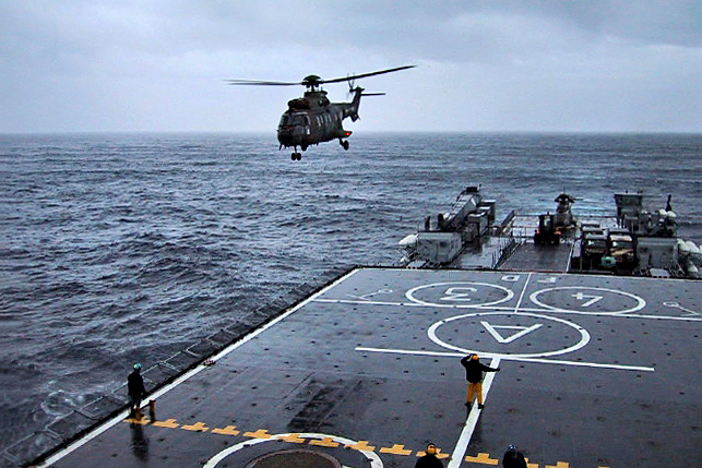 Le premier hélicoptère Cougar est attendu sur la plate-forme arrière du TCD Foudre