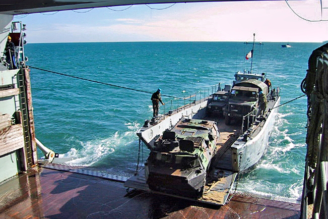 À l’arrière du navire, un chaland de débarquement vient de s’arrimer face au radier. On voit un VAB (Véhicule de l’avant blindé) débarquer. Le radier peut être immergé pour permettre aux chalands d’accéder directement à l’intérieur du bâtiment.