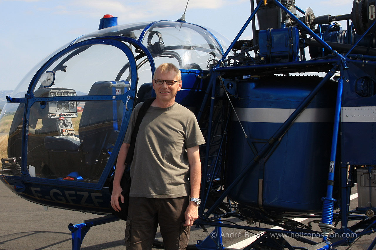 André Bour, devant l'hélicoptère Alouette II d'HELITTORAL. Récemment acquis, l'appareil était encore aux couleurs de la Gendarmerie Nationale