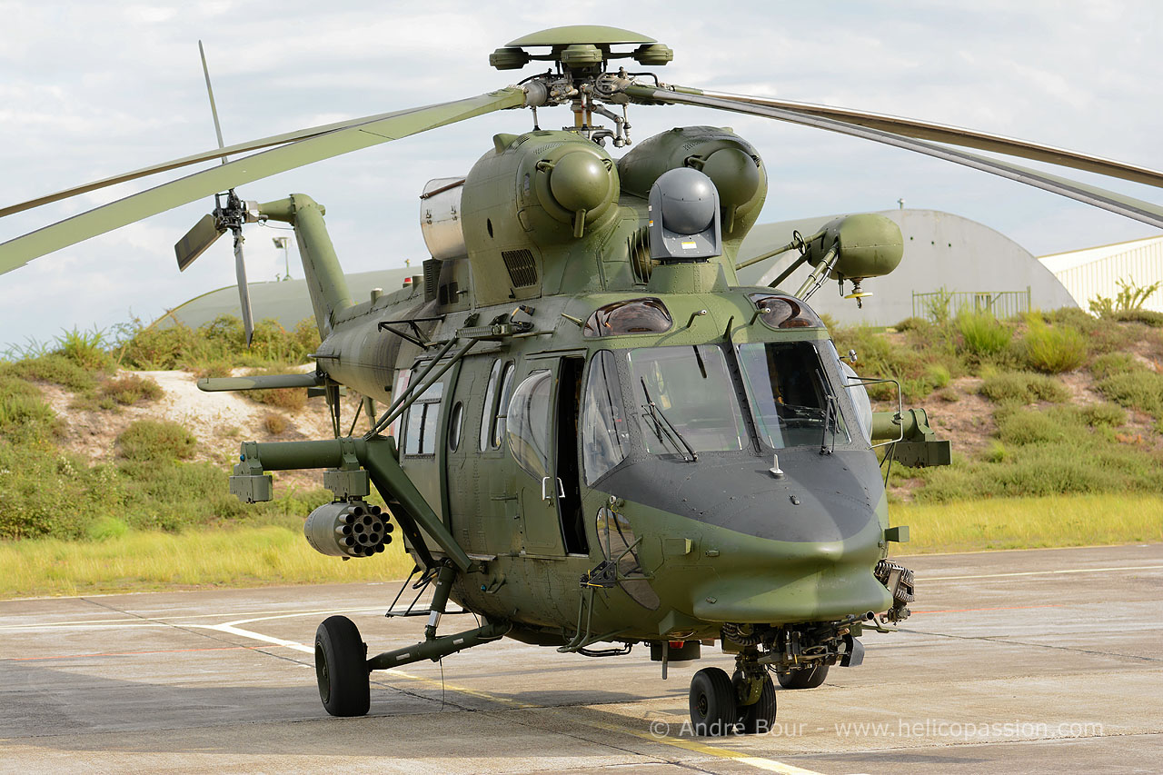(Photo André BOUR - HELICOPASSION) Panier de roquettes sous aileron latéral